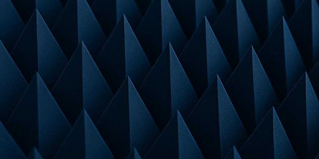 An RF pyramidal foam absorber is a type of material used in RF test chambers. It looks like a group of tall, pointed pyramids constructed from foam. The pyramids are used to absorb radio waves and reduce reflections inside the chamber.